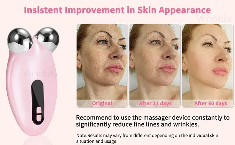 1. Das Massagegerät mildert feine Linien und strafft die Haut durch die Erzeugung von Mikrostrom und Vibrationen. Um einen Effekt zu sehen, ist jedoch eine langfristige Anwendung erforderlich. Ein oder zwei Spa-Besuche führen nicht zu einem deutlich sichtbaren Ergebnis. Normalerweise ist eine sichtbare Veränderung nach 21 Tagen oder längerer Anwendung zu erwarten.
