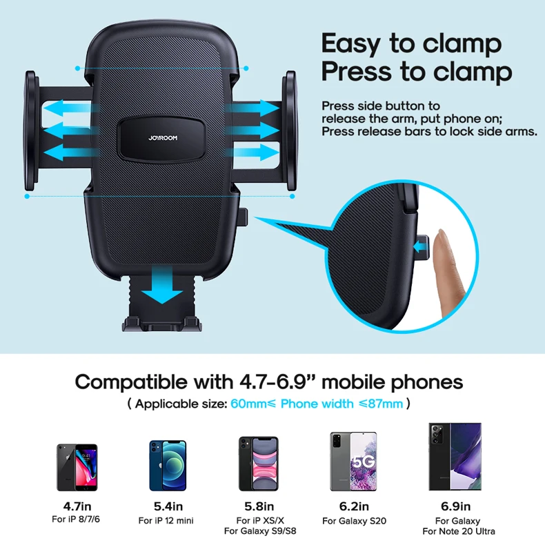 5. To ensure your phone is clamped firmly, please press the root of the clamp arms after placings the phone, and squeeze the arms until it clings closely to your phone.