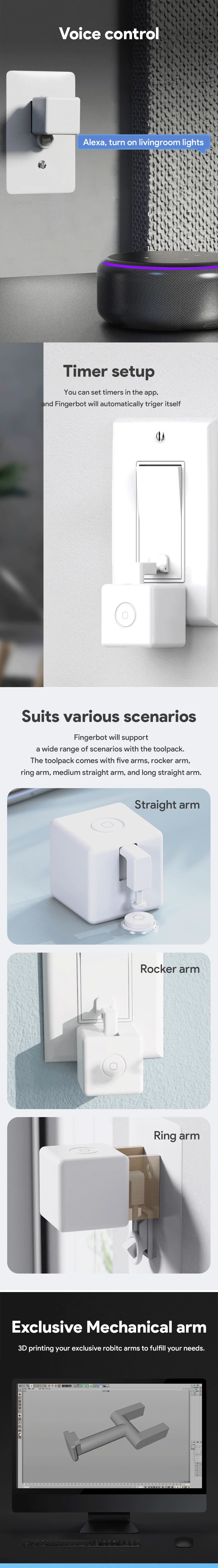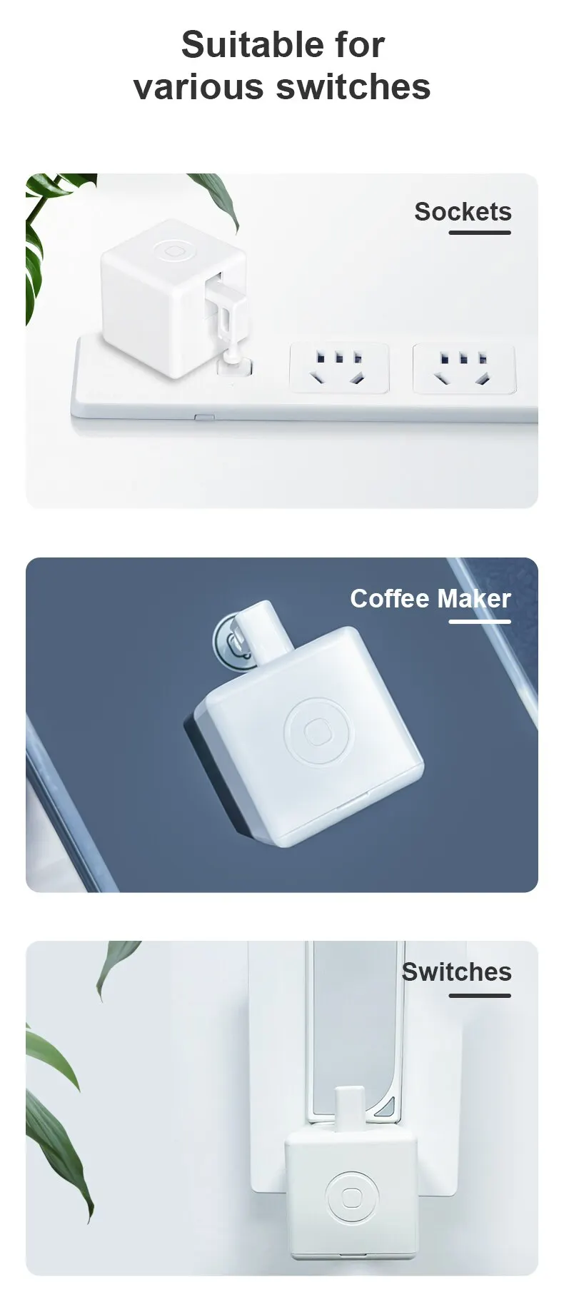 4.Fingerbot is compatible with a variety of keys and switches. It can be attached to any surface and upgrade your old equipment. Don't worry about installing in the opposite direction. There is an inverted switch option in the APP, which can adjust the position anytime and anywhere, saving time and electricity, and monitoring the battery power in real time to ensure the life. You can use Fingerbot for your lights, fans, coffee machines, garage doors, etc. In addition, the rocker switch can be reversed in both directions, and only one finger robot can push or pull on/off.
